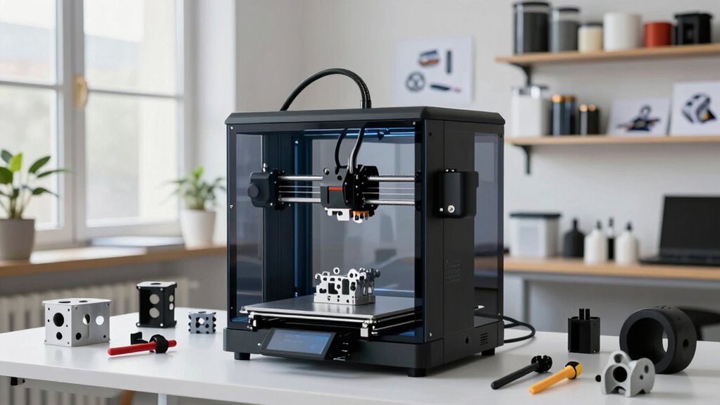 3D printers have moved far beyond their original role as hobbyist tools, transforming industries and everyday life. Today, they’re essential in fields like medical applications and industrial manufacturing, proving their value far beyond simple models and prototypes. In healthcare, 3D printing allows you to create custom implants, prosthetics, and surgical models tailored precisely to individual patients. This customization enhances patient outcomes, reduces surgery times, and improves the accuracy of treatments. For example, complex bone structures or dental implants can be printed to match a patient’s unique anatomy, making procedures more efficient and less invasive. Medical professionals now rely on 3D printing to develop detailed anatomical models for pre-surgical planning, giving you a clearer understanding of complex cases before stepping into the operating room. The ability to produce patient-specific devices quickly and cost-effectively has revolutionized healthcare, making personalized medicine more accessible. Additionally, the rapid prototyping capabilities of 3D printing allow for faster innovation and customized solutions in medical device development. As the technology advances, it also opens up opportunities for cost-effective production of complex devices and tools that enhance treatment options. The expanding variety of materials used in 3D printing means that applications in medicine can become even more versatile and sophisticated, accommodating diverse needs and innovations. In the domain of industrial manufacturing, 3D printers help you streamline production processes, reduce costs, and accelerate product development. Instead of waiting for traditional manufacturing methods, you can use 3D printing to create functional prototypes rapidly, test designs, and iterate faster. This agility shortens the time from concept to market, giving companies a competitive edge. 3D printing also enables the production of complex, intricate parts that would be difficult or impossible to manufacture with traditional methods, such as lightweight aerospace components or custom tooling. You can produce small batches or even one-off products without the need for expensive molds or tooling, saving both time and money. Additionally, the ability to produce on-demand parts reduces inventory costs and waste, making supply chains more flexible and sustainable. Both in medical fields and industrial settings, 3D printing offers unmatched versatility. You’re able to create tailored solutions, whether it’s a customized medical device or a complex industrial component, with precision and speed. This technology eliminates many of the limitations of traditional manufacturing, allowing you to innovate and adapt swiftly. Moreover, as 3D printing materials continue to diversify, you’ll find even more applications that can meet specific industry needs. As 3D printing technology becomes more accessible, more industries are discovering innovative ways to incorporate it into their workflows. As 3D printers continue to advance, their applications will only expand further, enabling you to push the boundaries of what’s possible in medicine, manufacturing, and beyond. The key takeaway is that 3D printing’s ability to produce bespoke, complex, and cost-effective items sets it apart as a transformative tool across multiple sectors. It’s clear that what once seemed like a hobbyist venture now plays a vital role in shaping the future of multiple industries.