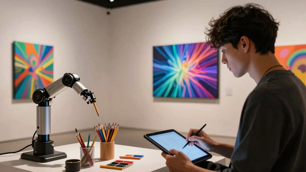 As this revolution unfolds, it’s clear that AI acts more like an enabler than a replacement. While automation might displace some jobs, it also creates millions of new roles, especially in prompting, controlling, and refining AI art tools. The creative pipeline is evolving into a fusion of human craftsmanship and machine efficiency, freeing artists to focus on high-level conceptual work. However, challenges remain. Ethical concerns over datasets, copyright issues, and transparency laws threaten to slow progress. Still, institutions like The Getty are integrating AI into their collections, signaling acceptance at the highest levels. As you navigate this changing landscape, remember that creativity isn’t disappearing—it’s being reshaped. The question isn’t whether algorithms will dominate, but how you can harness AI to elevate your art in a new era of hybrid creativity.