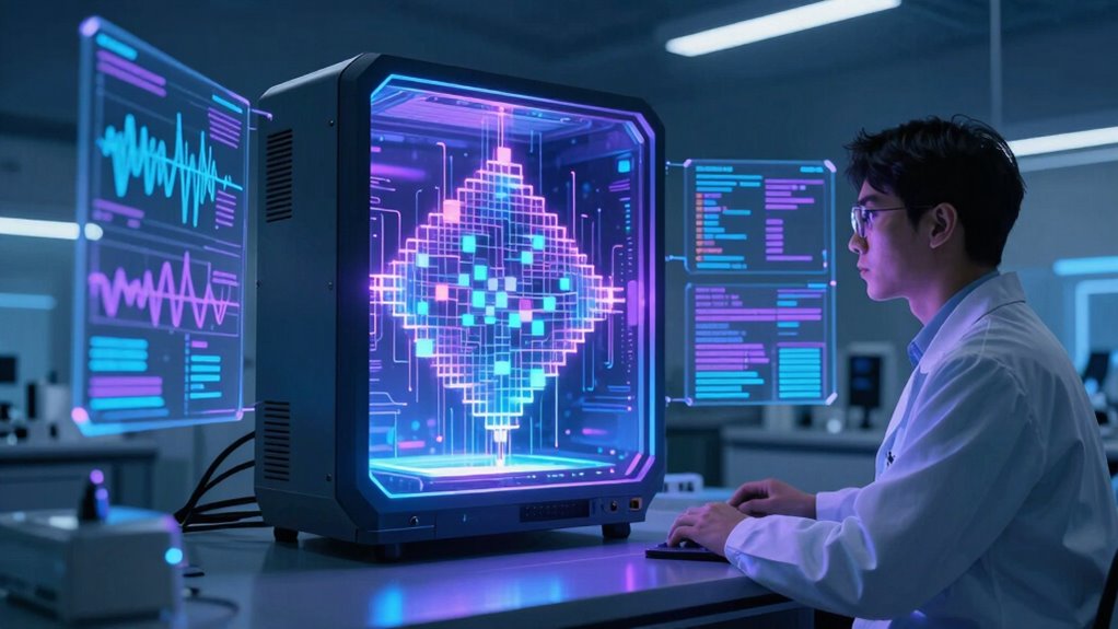 The technological breakthroughs supporting this shift include quantum hardware like Google’s Willow chip, which enables complex optimization, and Microsoft Azure Quantum, which integrates lower-error qubits. Hybrid quantum-AI systems accelerate discoveries across sectors, and Nvidia’s quantum simulators speed up algorithm development. Leading companies like Roche, IBM, and Atom Computing are collaborating on healthcare, manufacturing, and large-scale quantum systems. Governments, such as Singapore’s, are investing heavily, fueling this quantum leap. As these innovations unfold, you’ll witness a transformation where quantum computing not only enhances existing systems but revolutionizes industries, solving problems once thought impossible.