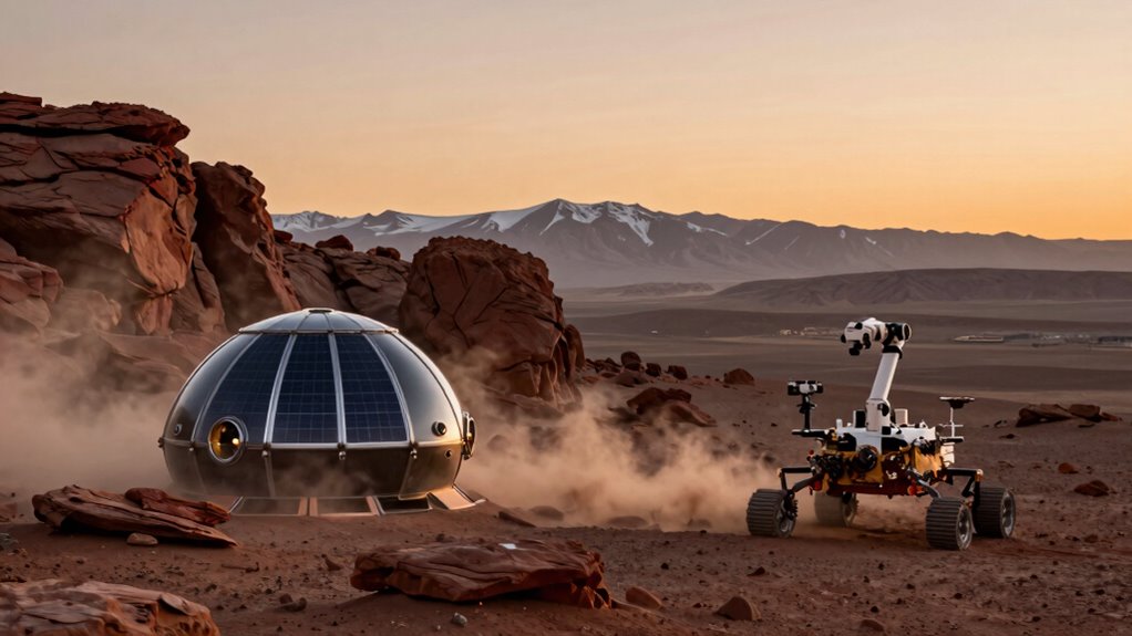 Think of Mars as a barren garden awaiting your nurturing. To keep it thriving, you’ll rely on robotic systems and advanced agriculture techniques like LED lighting and controlled environments. You’ll utilize resource utilization methods such as ISPP to produce oxygen and grow food. By continuously adapting, innovating, and maintaining these systems, you’ll turn this desolate planet into a sustainable home, proving your resilience and forging a new chapter in human exploration.