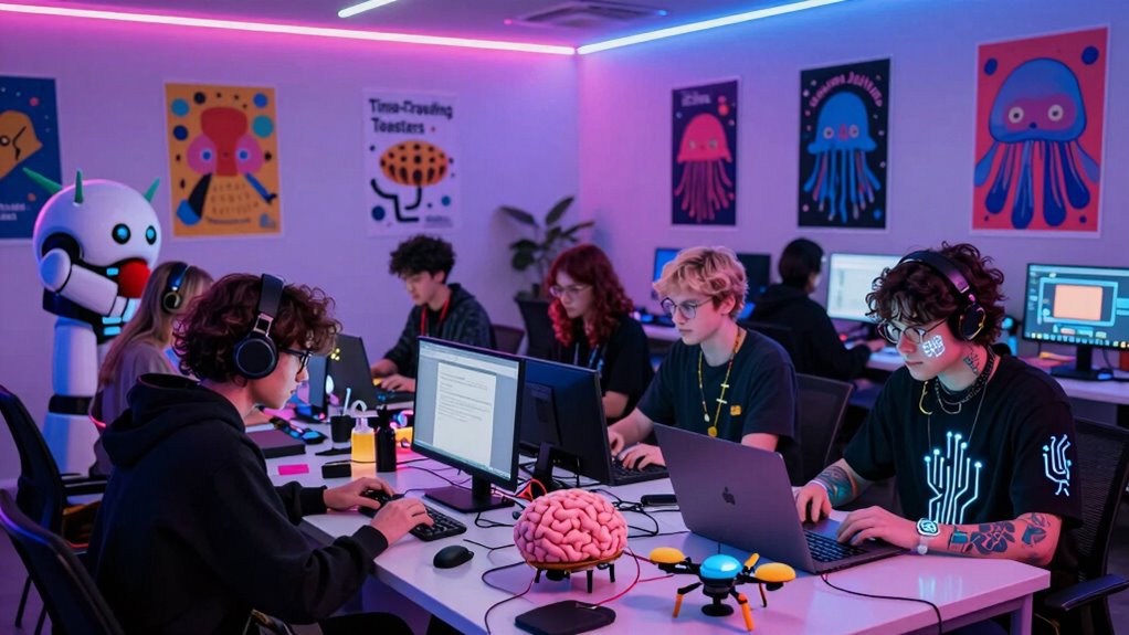 Have you ever wondered how hackathons can break away from traditional coding challenges and venture into the bizarre? Some events push boundaries by blending unlikely themes, creating immersive, often hilarious experiences that challenge your expectations. Take WildernessHackGT, for example. This event transforms the typical hackathon into an outdoor adventure, encouraging participants to act as trailblazers. You’ll work on coding challenges in scenic venues across the country while engaging with mentors during Campsite sessions—think of it as combining camping trips with tech innovation. The event’s outdoor setting enhances engagement, making it a literal and figurative journey into uncharted territory. Inclusive participation is often a feature of such themed hackathons, inviting diverse teams to embrace unconventional environments and ideas. Next, consider PrototypeFhacktory, where the stakes are high and the focus is on tangible results. Participants have just 24 hours to develop functioning prototypes that blend hardware and software. No room for ideas or concepts—if your prototype isn’t working, you’re disqualified. This theme flips the usual hackathon on its head by emphasizing real-world, testable products over mere ideas. It’s a fast-paced environment demanding rapid iteration and hands-on problem-solving, pushing you to think beyond the screen and into physical creation. This approach emphasizes practical innovation, making the experience more applicable to real-world challenges. Then there’s Hack the Wind, a theme centered on renewable energy and environmental sustainability. Here, you’re tackling open energy data to develop solutions for consumer devices, addressing challenges in energy distribution and production pathways. The goal is to promote eco-friendly tech that can help our planet. By linking coding directly to planetary health, it appeals to young minds enthusiastic to make a difference through innovative, code-driven environmental solutions. Another truly bizarre theme is Scrapyard Worst Ideas, where the goal isn’t to solve big global problems but to craft the silliest projects imaginable. Imagine building a shock bracelet that penalizes gambling losses or a rock-paper-scissors game that tases losers. It’s all about having fun with friends, creating absurd, often hilarious projects in just 24 hours. This hackathon emphasizes humor and camaraderie over polish or practicality, attracting students worldwide who want to push the limits of silly. Finally, events like HUBweek merge art, science, and technology, bringing together artists, entrepreneurs, and experts to spark creative intersections. Whether through small gatherings or large festivals, these hackathons foster interdisciplinary innovation, encouraging participants to think outside their usual fields. The bizarre themes serve to inspire unconventional ideas and challenge your perspective, proving that hackathons aren’t just about code—they’re about imagining new possibilities across all disciplines.