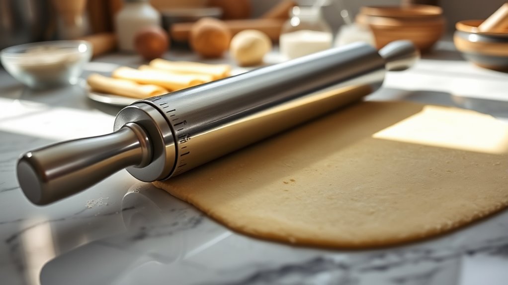 Since an adjustable rolling pin with removable rings offers precise control over dough thickness, it becomes incredibly versatile for baking a variety of treats like cookies, pies, bread, and pasta. The quick switch between different thickness settings allows me to adapt easily to each recipe’s needs. Many models have measurement markers and color-coded rings, making adjustments simple for both beginners and seasoned bakers. I appreciate how some models can convert from a guided adjustable roller to a traditional straight rolling pin, adding to their functionality. Choosing an adjustable rolling pin with multiple thickness options and easy-to-change settings streamlines my baking process and helps ensure consistent results across different baked goods. Its versatility truly makes it a valuable tool in my kitchen.