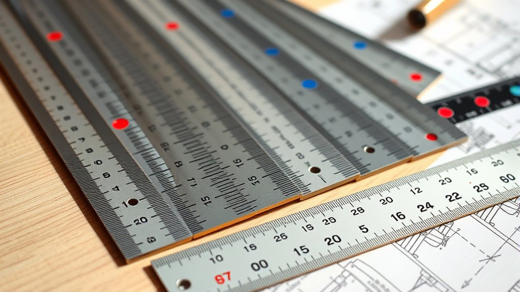 Imagine holding a sturdy bridge—aluminum rulers are much like that, offering durability and strength I rely on daily. They’re more resistant to dents, warping, and wear, making them ideal for heavy use. Plastic rulers, while lightweight and inexpensive, tend to crack or bend over time. I prefer aluminum for its longevity, especially when precision and resilience matter most in my work.