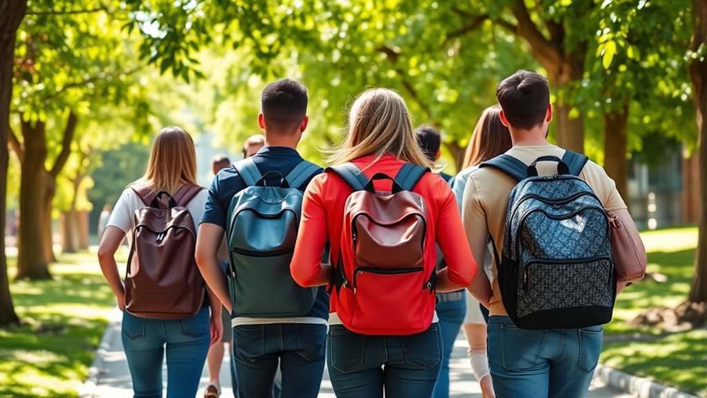 Think of your backpack as a fortress—security features are your walls. The most effective are lockable zippers, hidden pockets, and RFID-blocking compartments. I always opt for backpacks with anti-theft straps and slash-resistant materials because they act like a modern-day shield. These features give me peace of mind, knowing my belongings are protected, whether I’m in class or commuting. Stay vigilant and choose wisely to keep your valuables safe.