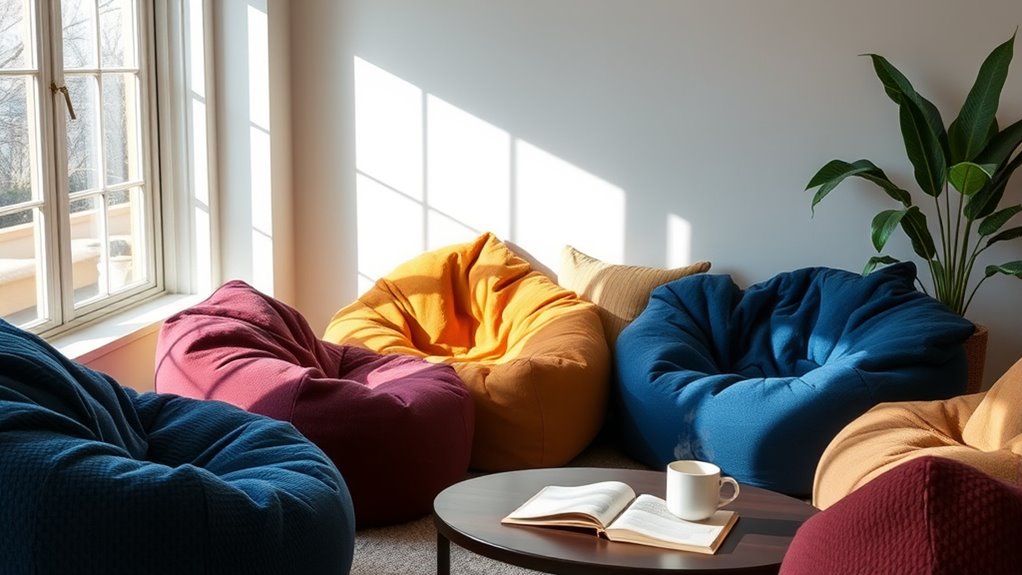 Choosing the right filling type for your giant bean bag chair is essential since it directly impacts your comfort and support. I’ve found that memory foam offers contouring support that really molds to my body, making it perfect for long lounging sessions. If you prefer a bit more customization, shredded foam allows me to adjust the firmness by adding or removing filling. For durability, high-resilience foam maintains its shape over time, preventing sagging and ensuring consistent support. I also pay attention to the density of the filling; denser options tend to last longer and support heavier individuals better. Ultimately, selecting the right filling can transform your lounging experience into something truly comfortable.