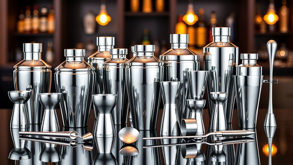 To match your home bar decor, I recommend choosing a shaker set that complements your style. If your space is modern, go for sleek stainless steel or matte finishes. For a vintage vibe, brass or copper sets add warmth. Consider your color palette and overall theme, and pick a set that either blends in seamlessly or stands out as a statement piece. Ultimately, I believe your shaker should reflect your personal style.