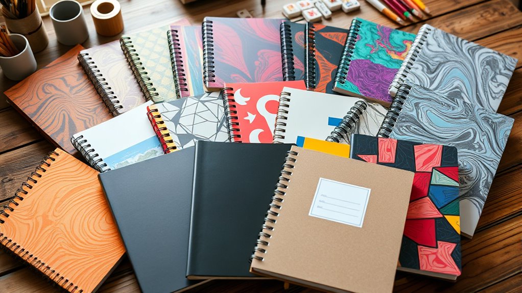 Paper quality and thickness vary widely among brands, affecting how I experience writing or sketching. Thicker, higher-quality paper feels more durable and prevents bleed-through, especially important for ink or markers. Brands like Moleskine and Leuchtturm often use premium paper, while others might opt for thinner options to keep costs down. I always check the gsm (grams per square meter) to guarantee my pages can handle my preferred tools without issues.