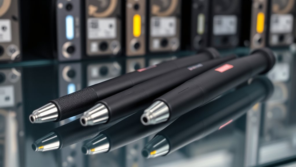 Choosing the right degaussing wand depends heavily on its power source, as this determines both compatibility with your electrical system and overall effectiveness. Most models require an external power source, typically a standard AC outlet, to generate the strong magnetic field needed for effective degaussing. Some operate on 110V or 220V AC power, so verifying compatibility with your electrical system is essential. Battery-powered options are rare because they can’t deliver the magnetic strength necessary for thorough data destruction. Additionally, continuous operation is usually limited to under three minutes to prevent overheating and power drain. Ensuring a stable voltage within the specified range is vital for safe, reliable, and effective degaussing performance. Your choice should align with your power infrastructure and operational needs.