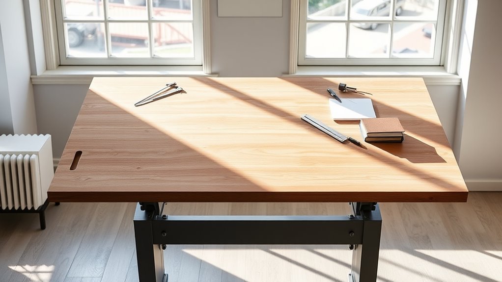 Think of your drafting table as a garden that needs regular care. I wipe it down with a damp cloth daily to remove dust and pencil marks. For stubborn stains, I use a gentle cleaner suitable for the surface. Keep the surface free of debris and avoid harsh chemicals. Regular cleaning not only keeps it looking sharp but also guarantees your workspace stays inspiring and efficient.