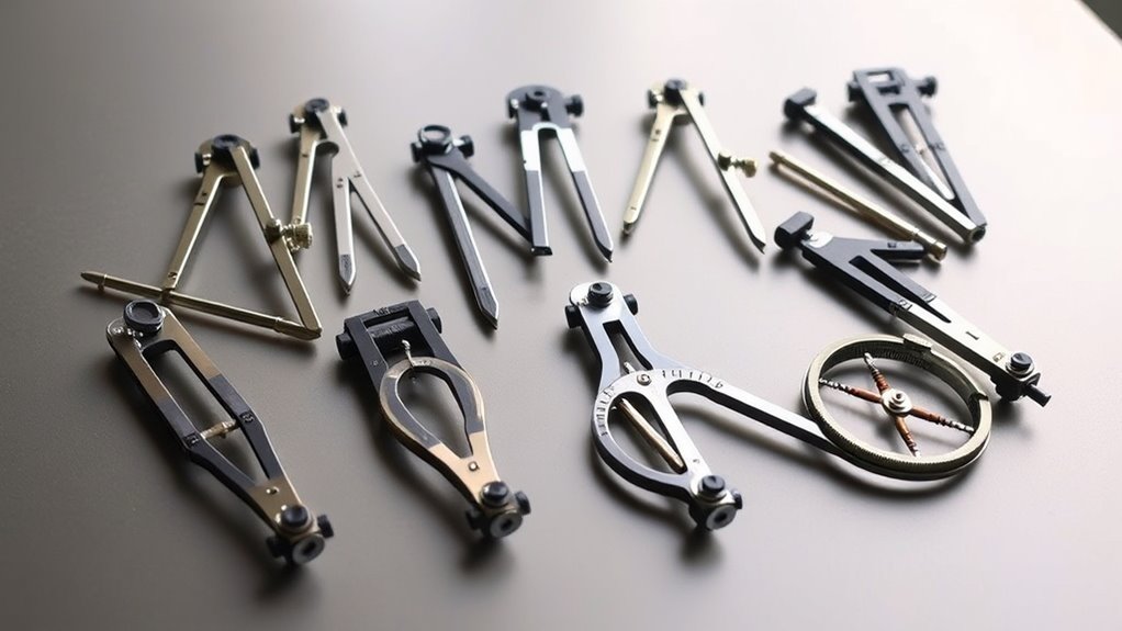 The way a drawing compass adjusts and secures into place can considerably affect your accuracy and efficiency. A precise adjustment mechanism, like a center wheel or screw, allows me to set the radius accurately without guesswork. Locking features, such as twist locks or push-button locks, keep the legs securely in place during drawing, preventing any unintentional changes. These locks are especially useful when creating multiple circles of the same size, ensuring consistency. I prefer adjustable locking systems that let me quickly change the radius while maintaining stability. Ease of locking and releasing matters too—stiff or overly complex mechanisms can slow me down or compromise precision. Overall, reliable adjustment and locking features streamline my workflow and enhance drawing accuracy.