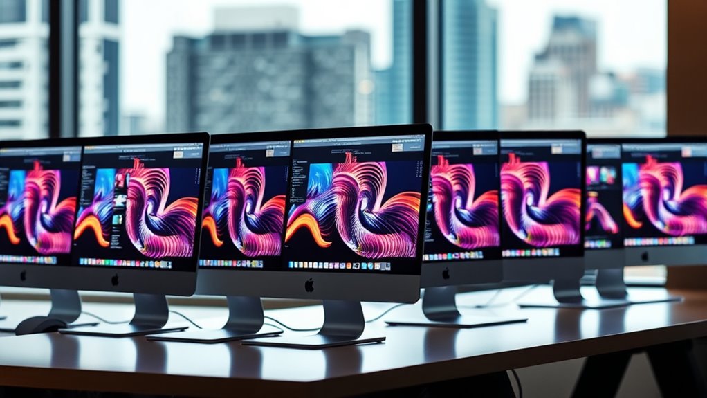 Choosing an iMac for photography means paying close attention to display quality and resolution, as these factors directly impact your editing accuracy. A high-resolution display of at least 4.5K or 5K guarantees sharp, detailed images, making it easier to spot fine nuances. Support for up to 1 billion colors offers a wide color gamut, allowing for precise color editing and smooth gradations. Brightness levels of 500 nits or higher improve visibility and assure colors stay true in different lighting conditions. Retina displays with high pixel density reduce pixelation, providing a clear, immersive view of your work. Additionally, treatments like Nano-Texture Glass can cut glare and reflections, maintaining visual clarity even in challenging environments. These aspects are essential for professional-quality photo editing.