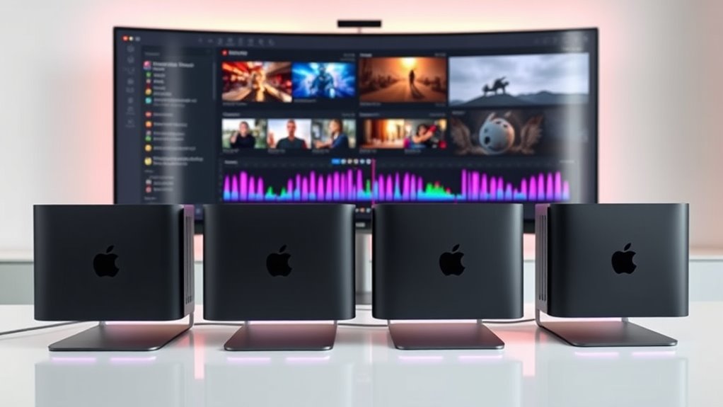 Since a powerful GPU directly affects how smoothly your video plays and renders, it’s crucial to prioritize graphics performance when selecting a Mac Studio for editing high-resolution footage. A robust GPU accelerates effects, transitions, and real-time previews, considerably reducing editing time. For 4K and 8K workflows, ample GPU cores and dedicated media engines are essential, especially for hardware-accelerated ray tracing and HDR processing. A high-performance GPU also streamlines encoding and decoding formats like ProRes, HEVC, and AV1, ensuring smoother playback and rendering. Additionally, choosing a Mac with strong GPU capabilities allows you to efficiently work across multiple high-res displays and handle complex visual effects simultaneously, making it an indispensable factor for professional video editing workflows.