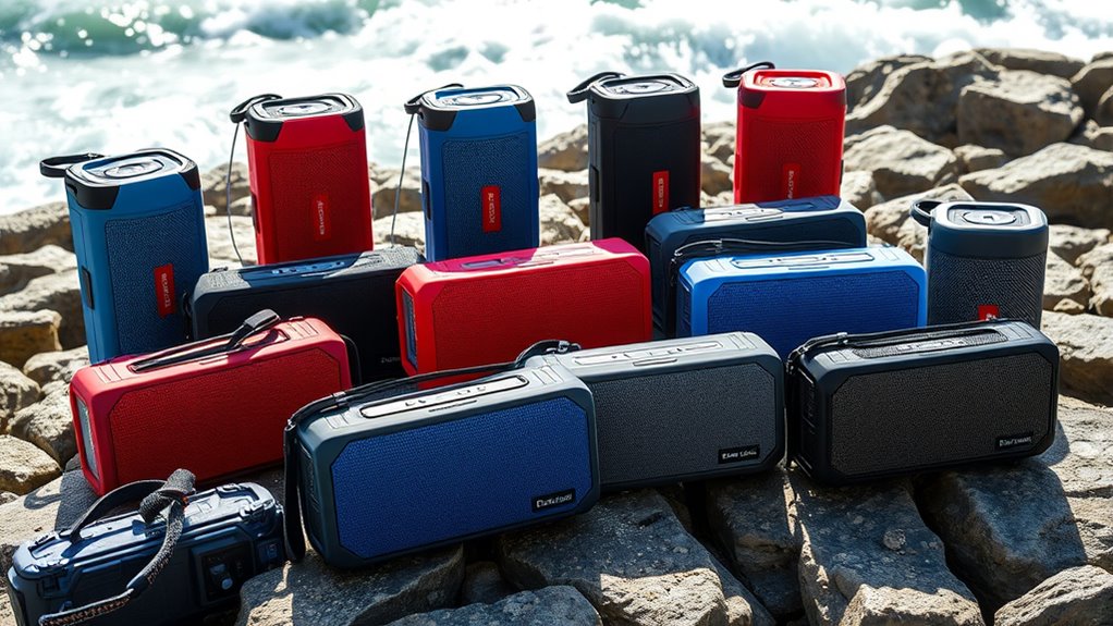 Understanding waterproofing level ratings is essential when selecting outdoor Bluetooth speakers, as they indicate how well a device can resist water ingress. Ratings like IPX4, IPX5, IPX6, IPX7, and IP67 measure a speaker’s water resistance, with higher ratings offering better protection. An IPX4 rating guards against splashes and light rain, while IPX5 can handle water jets from any direction—great for light rain and splashes. IPX6-rated speakers withstand powerful water jets, making them suitable for heavy rain. IPX7 devices can be submerged in water up to 3.3 feet for 30 minutes, ideal for poolside use. The top-tier IP67 rating combines dust protection with full water immersion, perfect for rugged outdoor environments. Knowing these ratings helps you pick a speaker that matches your outdoor adventures.