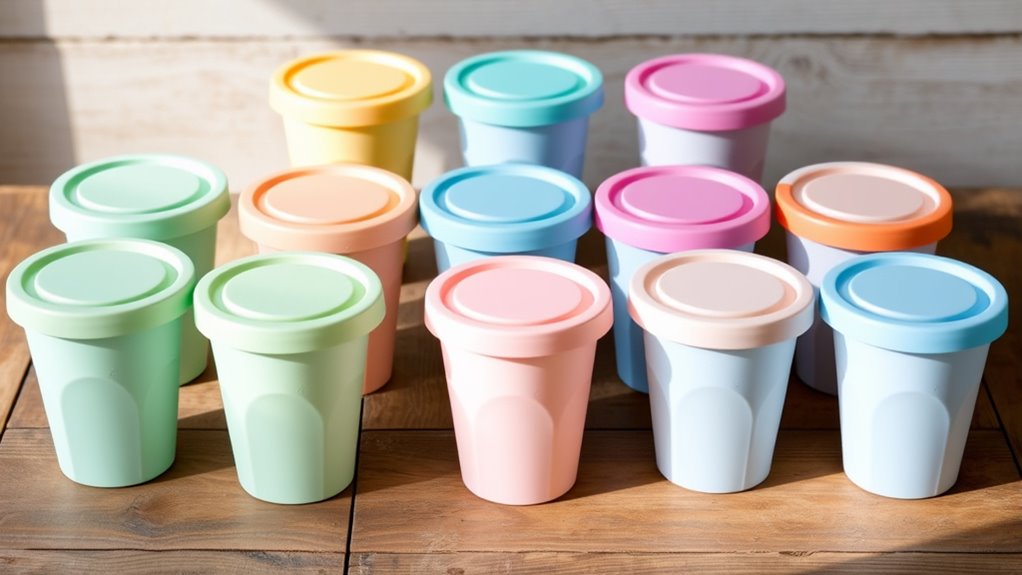 Choosing the right reusable gelato cups with lids depends heavily on material durability, as these containers must withstand frequent freezing, handling, and cleaning. I look for materials like BPA-free plastic, silicone, or high-quality polypropylene because they resist cracking and warping over time. Silicone, especially food-grade, offers flexibility and resilience against temperature swings, making it ideal for long-term freezer use. Rigid plastics made from thick, high-density materials tend to endure impacts and maintain their shape through numerous cycles. The lids and seals should also be sturdy and flexible, resisting tearing or warping to ensure a leak-proof experience. When selecting, I prioritize food-safe, durable materials that can handle dishwasher or microwave use without losing integrity, ensuring my gelato stays fresh and my containers last for many uses.