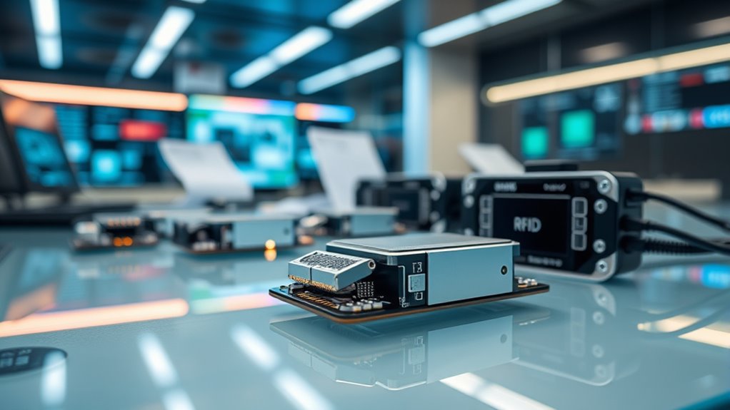 Choosing the right RFID cloning tool means guaranteeing it supports the specific chip types and frequencies of your cards. I always check if the device can read chips like T5577, EM4100, or EM4305 because compatibility with these chips ensures accurate cloning. It’s also essential to verify that the operating frequency matches my cards—most operate at 125kHz or 13.56MHz. Not all tools can handle encrypted or secured RFID tags, so I confirm whether the device can read protected cards if needed. Additionally, I consider whether the tool supports various card shapes and sizes, especially for irregular or hidden chips. Finally, I review if the device adheres to the protocols used by my RFID cards to guarantee proper copying and functionality.