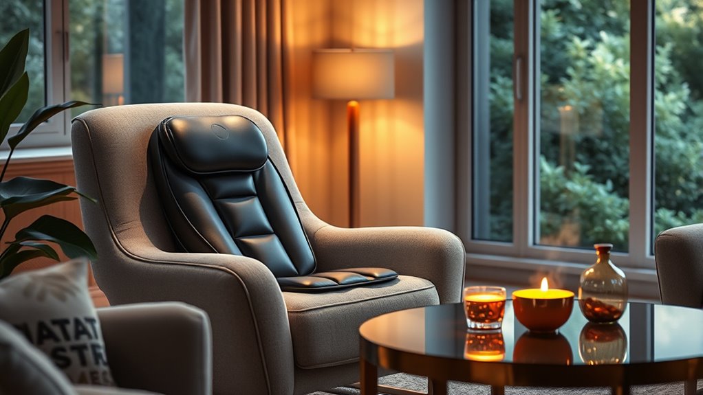 After finding a seat massager that’s portable and versatile, the next thing I focus on is safety features. I always look for overheat protection and automatic shut-off systems to prevent burns or electrical hazards during longer sessions. Many quality massagers come with UL-listed thermostats, ensuring they meet electrical safety standards. Adjustable timers are also a must, automatically turning off the device after a set period to avoid overheating or muscle strain. I appreciate models that monitor internal temperature and deactivate if it exceeds safe levels. Additionally, I check for safety certifications and clear warnings to guide proper usage. Prioritizing these features keeps my relaxation time safe and enjoyable.
