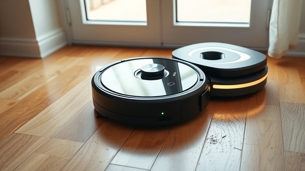 Advanced navigation and mapping technology are crucial for guaranteeing your self-emptying robot vacuum cleans thoroughly and efficiently. Systems like LiDAR and HD cameras allow the vacuum to create detailed maps of your home, planning ideal cleaning routes. Real-time mapping keeps the robot updated on layout changes, so it adapts during cleaning sessions. Features like no-go zones and virtual walls give you precise control over where it cleans, enhancing customization. High-precision sensors are necessary for obstacle avoidance and stair-fall prevention, reducing accidents and missed spots. These advanced technologies ensure complete coverage, especially in complex, multi-room layouts. By investing in a vacuum with top-tier navigation and mapping, you’ll enjoy more effective cleaning, less manual intervention, and a smarter, more responsive cleaning experience overall.