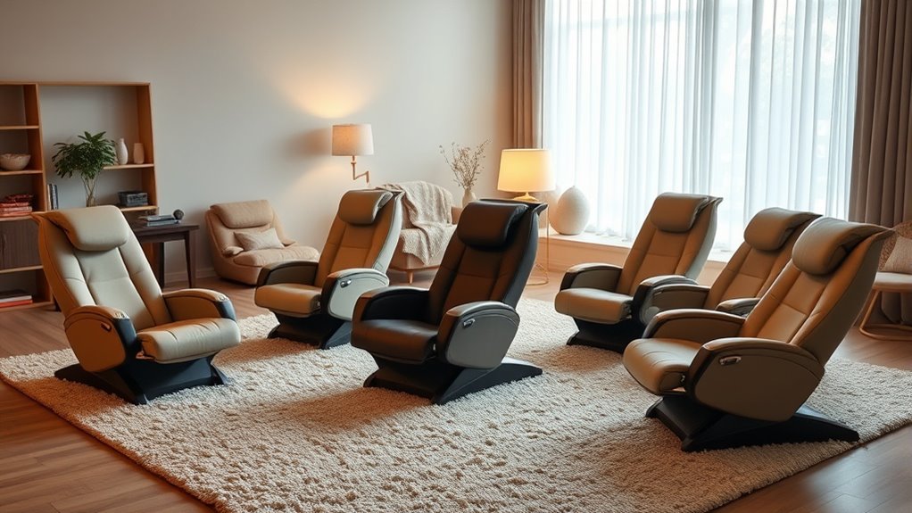 Finding the right Shiatsu kneading seat isn’t just about comfort and customization; safety and durability are just as important. I always look for models that feature overheat protection and auto shut-off capabilities, especially for extended use. It’s vital to verify that the materials used are high-quality, like reinforced stitching and sturdy frames, to endure regular massage sessions. Certifications like UL or CE approval give me peace of mind about safety compliance. I also prefer models with reinforced straps or secure attachment systems to prevent any slipping during use. Finally, considering the manufacturer’s warranty and their customer support reputation helps ensure I can rely on my investment for the long haul.