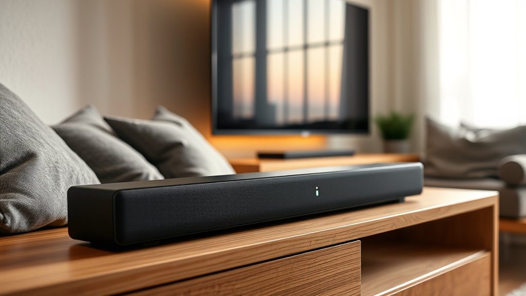 Choosing the right soundbar for a small room is like planting a seed—when you pick the perfect one, it blooms into a full, vibrant soundscape that transforms your space. Think of each model as a tiny lighthouse, guiding your audio experience through the shadows of compact spaces. With the right choice, you’ll fill your room with rich, immersive sound, turning every movie night into a mesmerizing journey. Let your soundbar be the beacon that illuminates your entertainment.