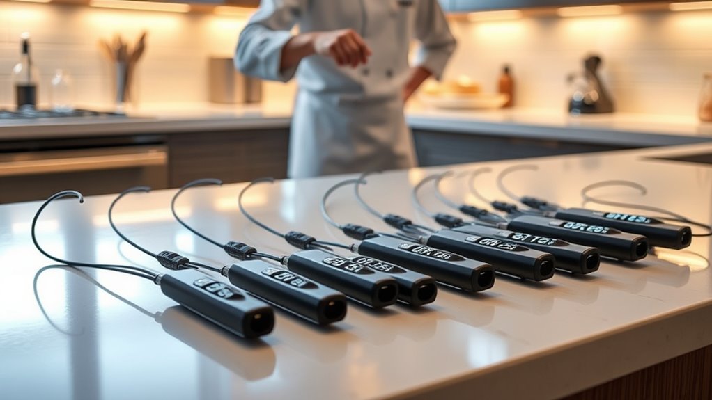 Think of a sous-vide stick like a vigilant guardian, always watching over your cooking. Many models have built-in safety features like automatic shut-off if they overheat, acting as a safeguard against potential hazards. These sensors are designed to detect excessive temperature rises and cut power, ensuring your device stays within safe limits. Rest assured, modern sticks prioritize safety, so you can focus on creating perfect meals with peace of mind.